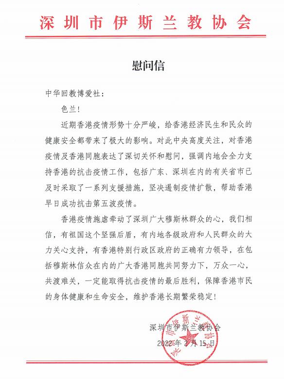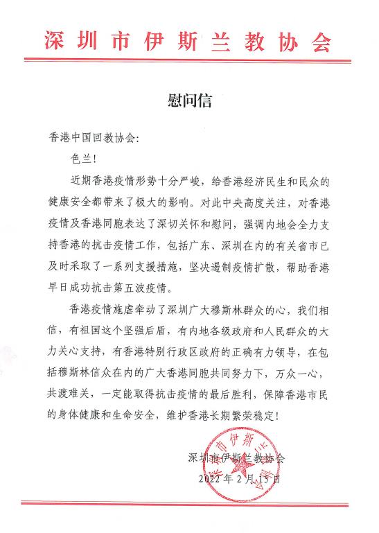 深圳市伊斯兰教协会向香港主要伊斯兰教社团发去慰问信