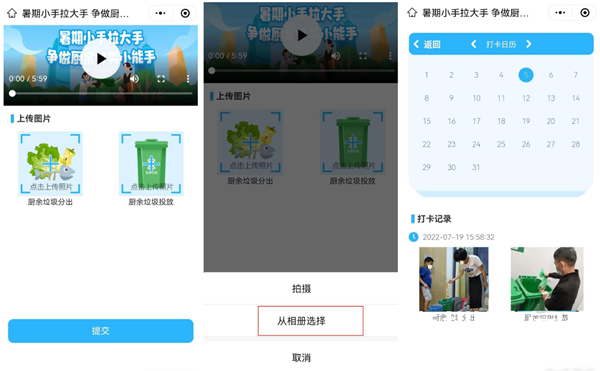 需要注意的是,学生在上传照片时,须上传每日厨余分类和厨余投放照片,不可重复使用同一张照片进行打卡,当日多次上传照片仅记录打卡签到1次;此外,如上传与厨余垃圾分类无关的照片,系统将自动作废当次打卡,判定该次打卡无效。