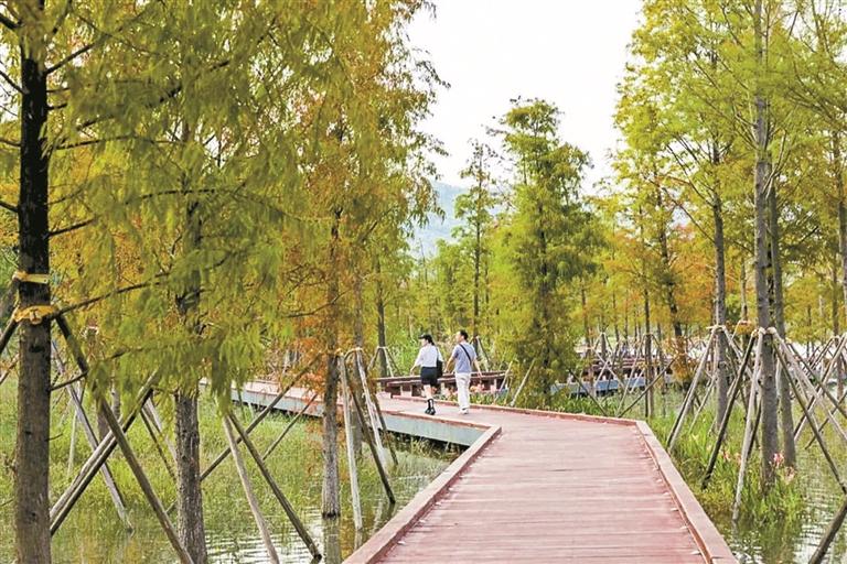 九围湿地公园的落羽杉渐红。(宝安区城市管理和综合执法局供图)