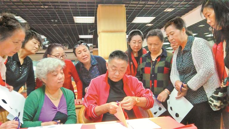 ▲吴自力(中)教社区居民剪纸。受访者供图