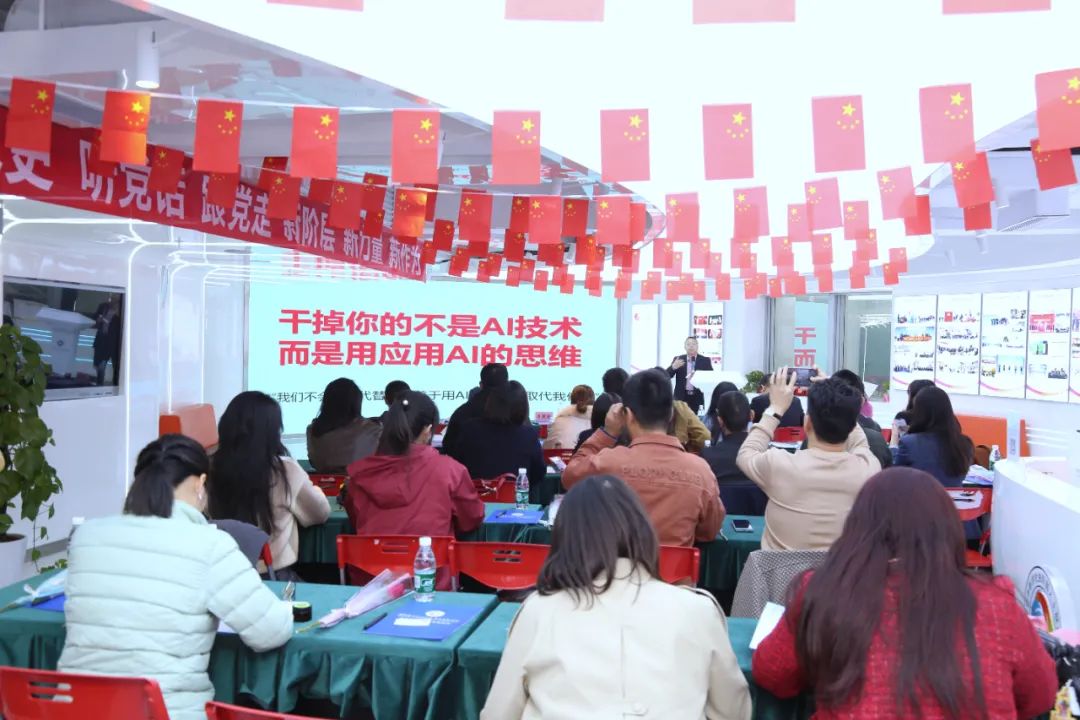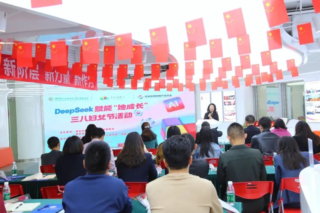 活动邀请了高级工程师、深圳物联网产业协会产业专家刘晖以“AI协同·智慧赋能——DeepSeek驱动产业创新与智慧治理”为主题,通过理论阐释与案例解析相结合的方式,系统论述了DeepSeek等前沿AI技术的创新应用。一个多小时的分享中,刘教授首先通过DeepSeek、天工等AI工具进行现场技术演示,为与会女性代表即兴创作节日祝福歌曲,生动展现了AI技术的场景化应用潜力。随后以深入浅出的授课方式,深度解构DeepSeek现象级发展的底层动因,聚焦实际应用,详细阐释了如何将DeepSeek及其他AI工具,有效运用到日常生活、职场工作及企业发展和科技创新等诸多行业场景之中 。